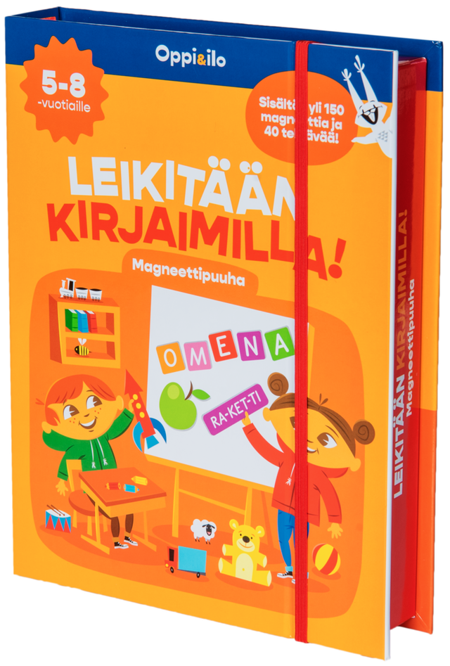 Leikitään kirjaimilla! Iloinen magneettipuuha johdattaa kirjainten ja sanojen maailmaan. Monipuolisissa tehtävissä yhdistetään riimipareja, tunnistetaan äänteitä ja kuljetaan kirjainreittejä. Taitojen kartuttua muodostetaan kokonaisia sanoja ja ratkotaan puuttuvia kirjaimia ristikoista. Leikkiä voi yksin tai yhdessä! Kestävillä magneeteilla voi kehittää lukemattoman määrän omia kirjain- ja sanapuuhia, joten iloa riittää pitkäksi aikaa.