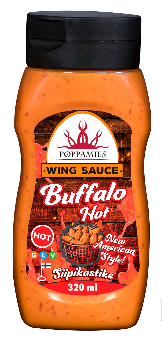 Poppamies Buffalo Hot -sås ger äkta Buffalo-stil till vingarna, och erbjuder en klassisk smakupplevelse med en eldig kick.