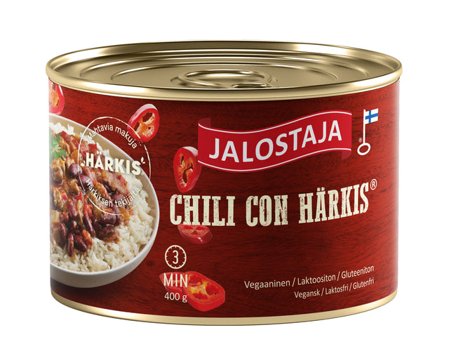 Jalostaja Chili con Härkis® ist laktosefrei, glutenfrei und vegan und lässt jedem Feinschmecker das Wasser im Mund zusammenlaufen! Das Produkt enthält reichlich Härkis®, das sowohl Veganern als auch Mischköstlern schmeckt. Die Sauce muss nur erhitzt werden, bevor sie genossen werden kann, zum Beispiel mit Reis, was sie perfekt für hektische Wochentage oder unterhaltsame Ausflüge macht. Die Konserven von Jalostaja, die in Finnland hergestellt werden, sind einfache Lebensmittel, die im Alltag helfen. Es ist einfach, unsere Konservendosen zu sortieren – spülen Sie die Dose aus und legen Sie sie in die Metallsammlung. Alle Konserven von Jalostaja halten sich lange ungeöffnet bei Raumtemperatur.