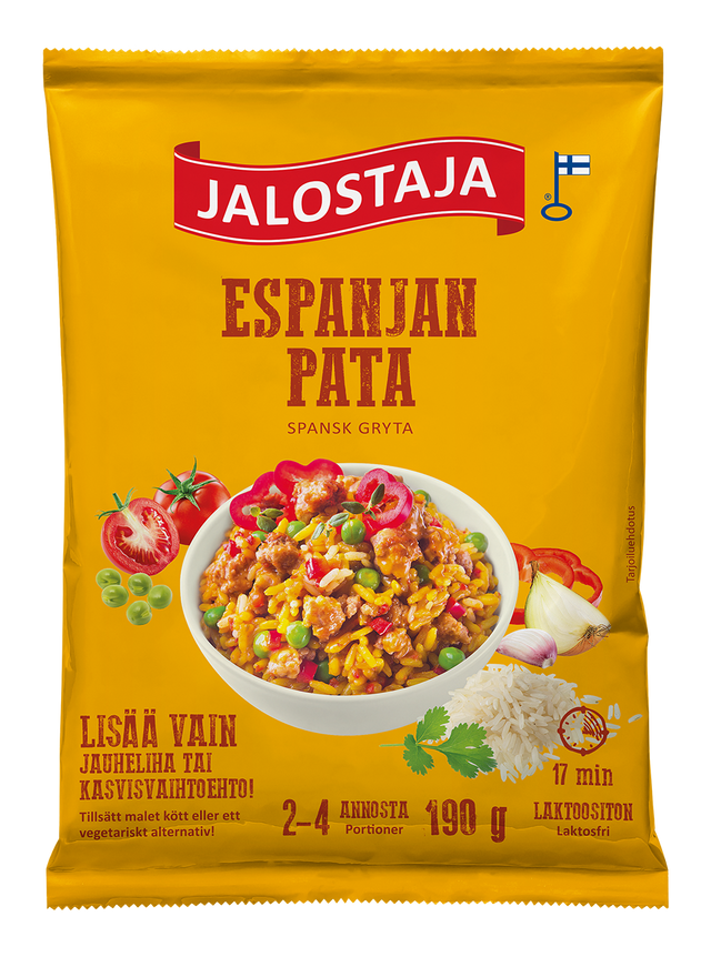 Jalostajas Spanische Pfanne ist ein schnelles Alltagsgericht, das selbst die am meisten gestressten Köche mögen. Eine ungeöffnete Verpackung hält lange, wenn sie trocken und bei Raumtemperatur gelagert wird. Jalostajas Eintopf-Zutaten, die in Finnland zubereitet werden, sind ein finnischer Fertiggericht-Klassiker. Mit den Eintopf-Zutaten bereitest du schmackhafte hausgemachte Gerichte einfach und schnell zu, da die praktischen Beutel alle trockenen Zutaten enthalten, die für eine Mahlzeit benötigt werden. Einfach, besonders für Anfänger oder gestresste Köche!