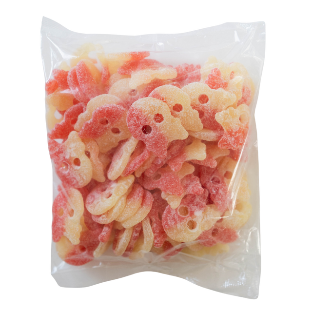 Sitruunan ja vadelman makuisia pehmeitä pääkallon muotoisia makeisia.