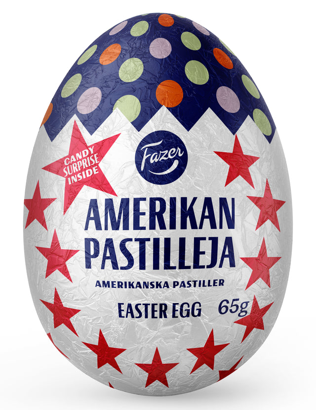 Amerikanska Pastiller chokladägg är en påskgodis med en spännande överraskning: inuti chokladägget gömmer sig mini Amerikanska pastiller! Chokladägget kommer garanterat att sprida glädje och spänning till alla!Vi köper kakao in enlighet med Fazers kakaovision. Läs mer www.fazercocoavision.com.