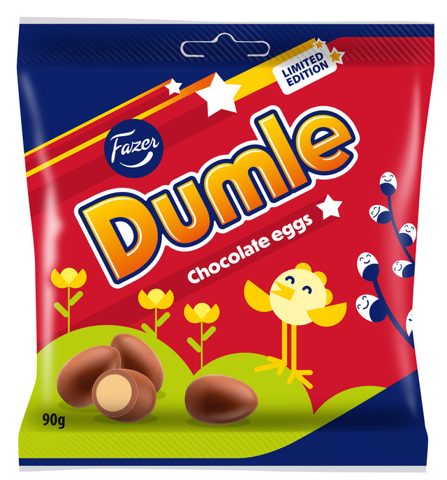 Dumle Chokladägg är en påse full av miniägg med mjölkchoklad, härligt mjuk fyllning och smak av Dumle. Överraska dina vänner med den lilla påsen eller dekorera påskens bakverk med de härliga chokladäggen. Vi köper in kakao i enlighet med Fazers kakaovision. Läs mer www.fazercocoavision.com.