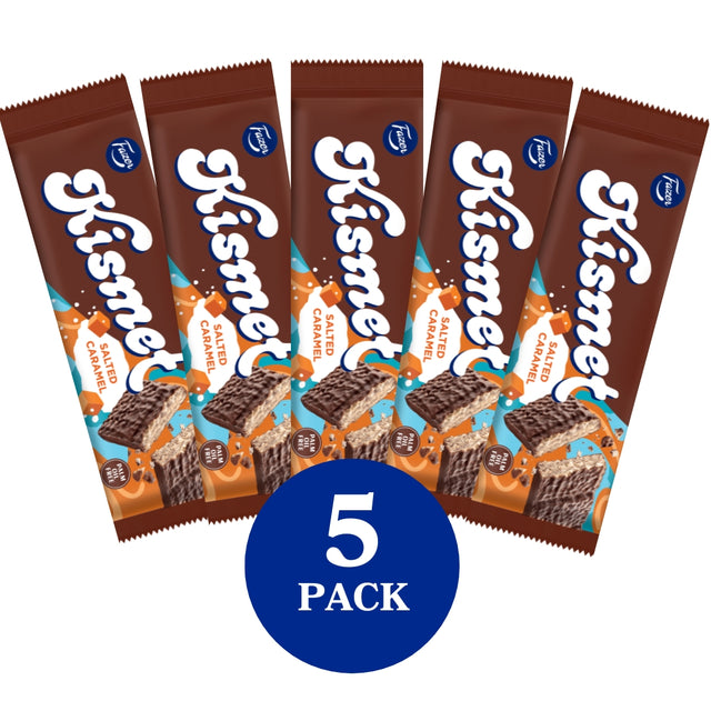 Den underbart frasiga våfflan Kismet har varit en favorit alltsedan 1974. När Kismet överdragen med Fazers sammetslena mjölkchokladsmakande överdrag ingår ett förbund med Salted caramel smakande fyllning skapas en oemotståndlig kombination. Och bäst av allt: Kismet våfflan tillverkas utan palmolja. Vi köper in kakao i enlighet med Fazers kakaovision. Läs mer www.fazercocoavision.com.Avnjut Kismet Salted caramel-våfflan som ett läckert mellanmål – så gott, att man inte sägas!