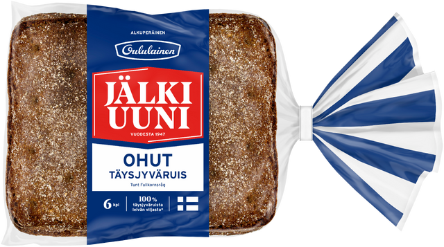 Schmecken Sie das köstlich dünne und zähe Brot Jälkiuuni Tunt Vollkornroggen! Jetzt gibt es die vertraute, echte und kräftige Roggen-Geschmack des Nachbackbrotes in einer dünnen Version. Gebacken in Finnland aus finnischem Getreide, das zu 100 % aus Roggen besteht.