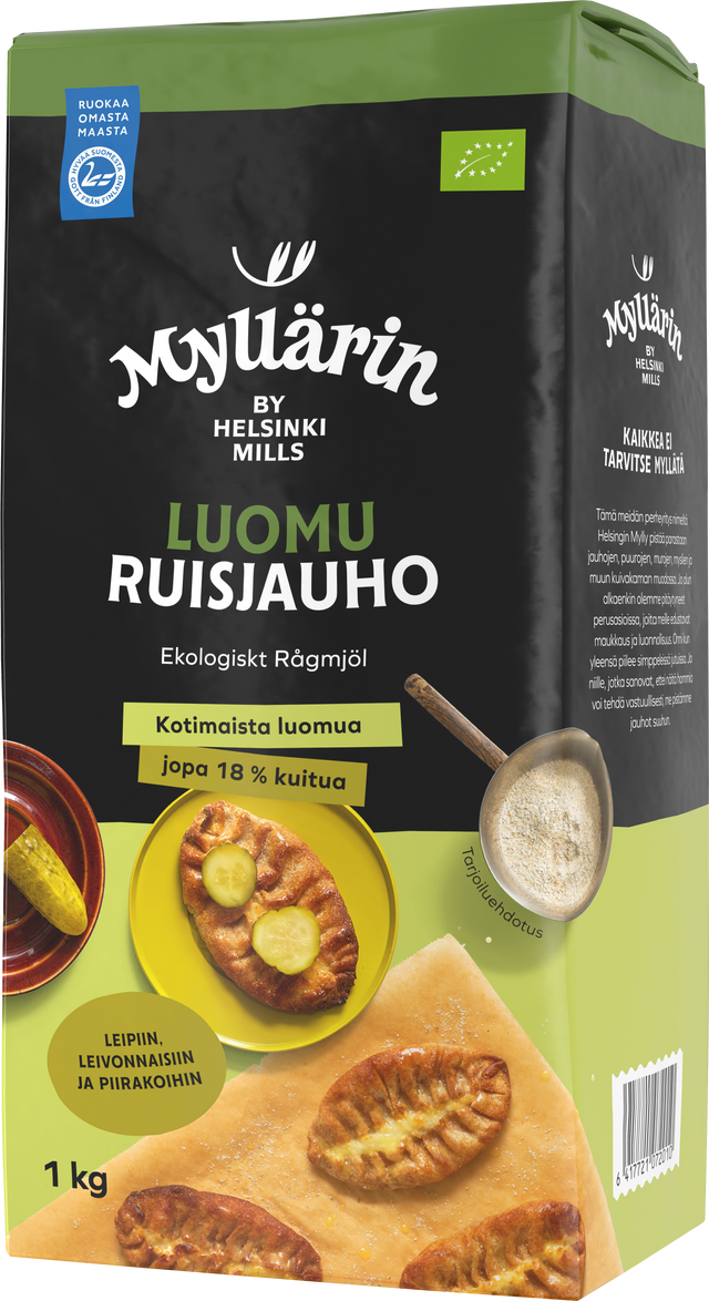 With Mylläri's organic rye flour you can create crispy breads and pies, as well as sweet pastries. The high-fibre product has the Hyvää Suomesta - Produce of Finland swan mark of origin and the EU Organic label. The package can be recycled as cardboard.