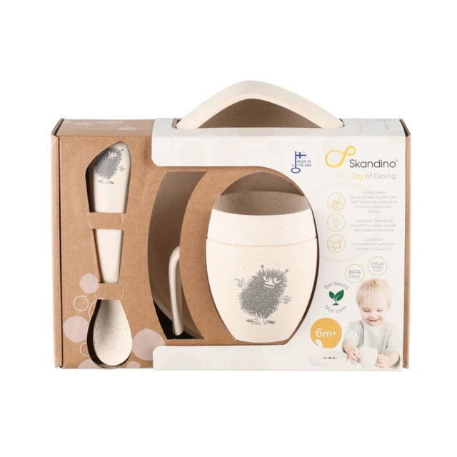 The set includes a mug, plate and spoon. The mug supports natural swallowing and develops the skill of drinking from a mug. The long handles of the Skandino® spoutless mug make it easy to use. The stopper lid and the downward tapering shape support the safe development of drinking. The mug can be used without the lid when the child has learned to drink independently. The sloping design of the plate supports the child's independent eating skills. The vertical edges keep the food on the plate, and the sloping shape of the base makes it easier to use the spoon. The sloping base allows the food to flow to the corner of the plate, from where it can easily be spooned. The spoon is ideal for small hands and mouths. Ergonomic design, suitable for both right and left-handed people. The design of the spoon is excellent for a child practicing independent eating. The handle of the spoon is easy to grip; it is comfortably wide and of suitable length. The spoon part is shallow, which allows the food to go into the child's mouth and not remain on the spoon.