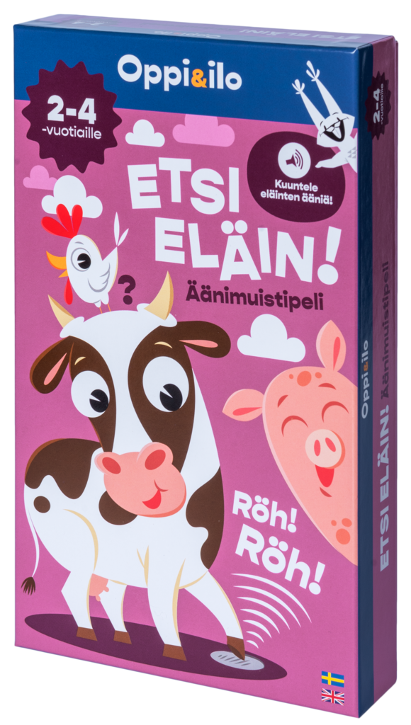 Game board with sound buttons + 12 animal picture cards, instructions in Finnish + Swedish + English