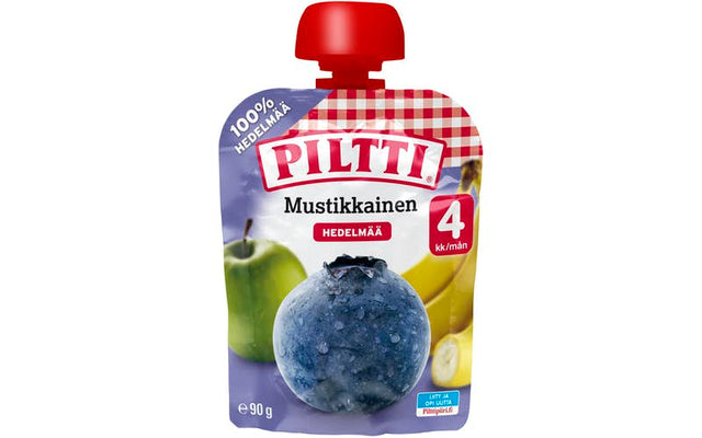 Piltti Mustikkainen is an unsweetened fruit puree with a good fruit taste. The product is 100% fruit. Suitable as a snack or dessert for children from 4 months of age.