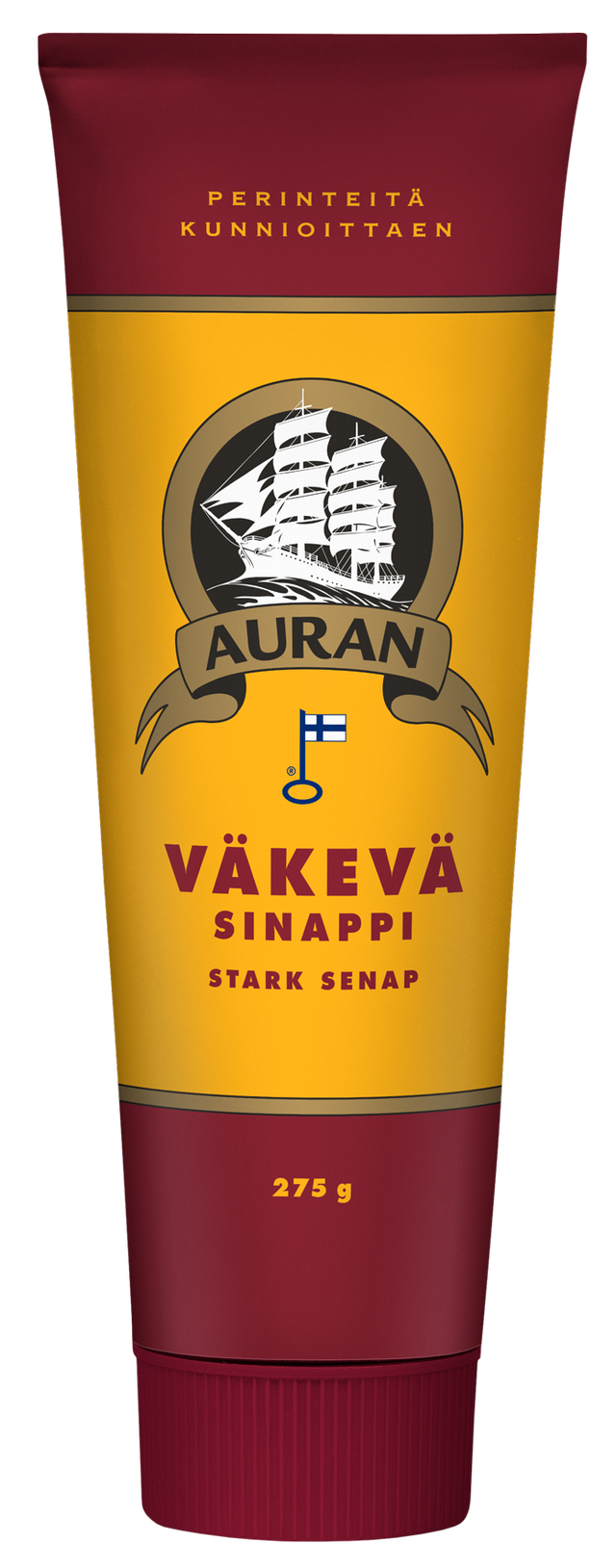 Auran Strong mustard has primitive power that wins mustard fans over. The mustard is still produced using the genuine, original production method, in which mustard seeds are ground in a stone mill. Mustard is at its best with pea soup and BBQ dishes but is also an excellent partner to ham and sandwiches. Auran mustards are made in Turku, Finland, according to traditional methods. Everyone will certainly find their favourite tube or bottle of mustard in our diverse mustard selection.