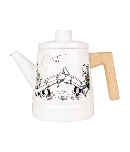 Moomin Originals - enamel pot suitable for use on all stove types and open fire. Handcrafted, product appearance may vary. Wooden handle. Hand wash. Designed in Finland. The I Miss You enamel coffee pot is part of the Moomin Originals product line, whose products are illustrated with original illustrations by Tove Jansson.
