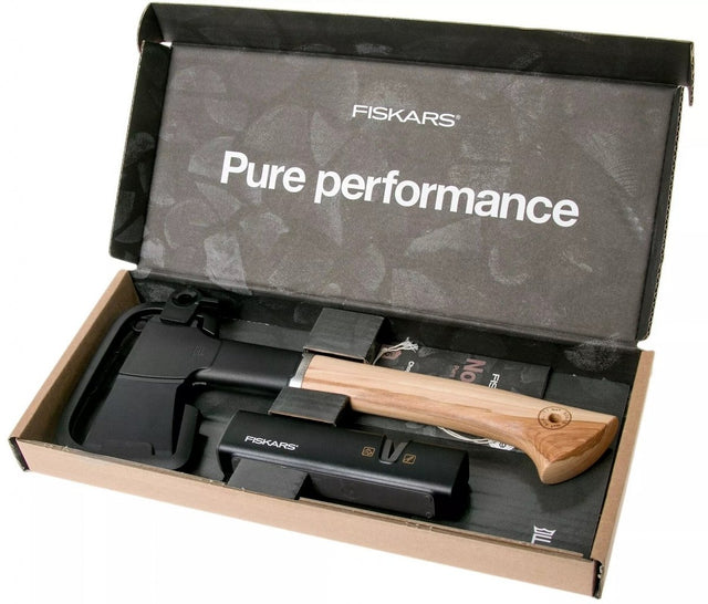 This set also includes a Fiskars ax and knife sharpener. The ceramic whetstone has clearly marked grooves for both axes and knives. The graphic on the side of the sharpener indicates the correct position for ax and knife sharpening.
