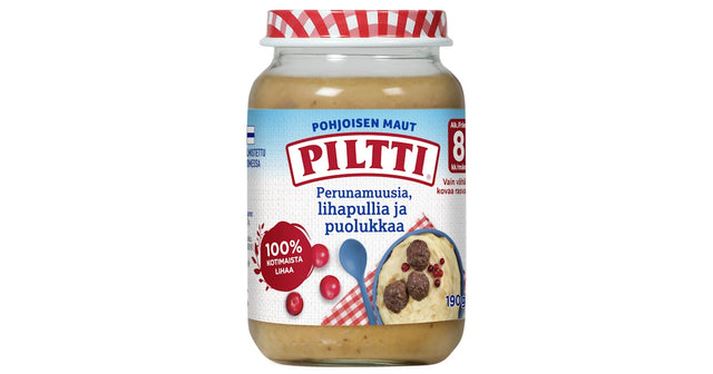 PILTTI Pohjoisen Maut Potato puree, meatballs and lingonberries is a traditional recipe developed for Pohjoisen's little ones, with vegetables and Finnish beef. Lingonberry puree adds extra spice to the meal. This meal contains only a little hard fat and no added salt. Piltti Pohjoisen Maut Potato puree, meatballs and lingonberries is suitable for babies from 8 months of age. The meal is an easy and quick meal for your baby, and it contains small pieces for chewing practice. Responsibility is important to us and we are proud of our Turku baby food factory. All of our glass jar products are manufactured at our Turku baby food factory with 100% renewable energy. No waste is sent to landfill from our factory. Read more about our responsibility at www.piltti.fi PILTTI baby food recipes are developed to suit the nutritional and composition needs of different age groups, in accordance with Finnish nutritional recommendations and regulations.