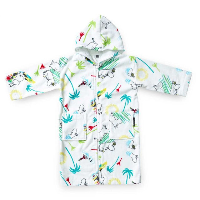 Palmumuumi-kylpytakin pinta on painettua, samettimaisen sileää froteeta, kylpytakin sisäpuoli on kuivaavampaa froteeta. Kylpytakissa on huppu ja kätevä vetoketju sekä tilavat taskut edessä. Kylpytakin mitoitus on reilu ja sen avoin helma helpottaa liikkumista. Kylpytakista on saunojalle ja vesipedolle iloa pitkään. Se on helppo vetää päälle saunan ja kylvyn jälkeen – mökillä, rannalla ja uima-altaalla kylpytakki lämmittää pientä uimaria ja suojaa tarvittaessa auringon paahteeltakin. Palmumuumi on 100 % puuvillaa ja saatavilla kahdessa lasten koossa. Tutustu myös Palmumuumi-huppupyyhkeeseen.