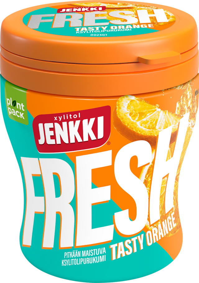 Jenkki Fresh Tasty Orange xylitol tuggummi smakar som en saftig apelsin. Tuggummit är förpackat i en återförslutningsbar burk som är tillverkad 75 % av växtbaserad plast. Mer information på cloetta.com/plantpack Avsedd som en del av väl balanserad och månsidig diet och sund livsstil. Sockerfritt tuggummi bidrar till att neutralisera placksyror. Effekten uppnås när två bitar tuggummi tuggas 20 minuter efter intag av mat eller dryck.