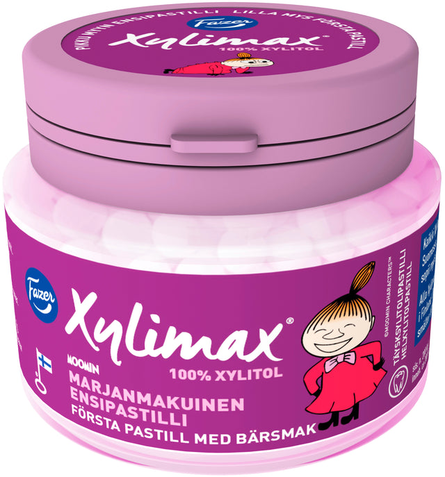 Kotimaiset Xylimax Moomin-täysksylitolipastillit ovat lapsiperheiden suosikkeja. Helposti suussa sulavissa Pikku Myyn ensipastilleissa on mukavan marjaisa, luonnollinen maku. Päällystämättömät pastillit sopivat myös perheen pienimmille. Ksylitolilla makeutetut pastillit eivät sisällä gelatiinia ja sopivat myös vegaaneille. Helposti suljettava, superriittoisa purkki kulkee kätevästi mukana pieniin tai suuriin seikkailuihin.