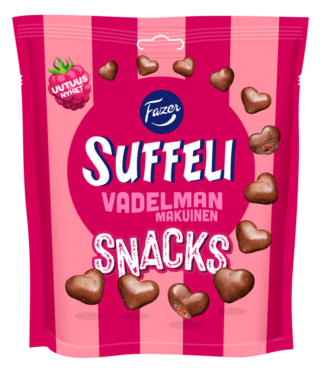 Suffeli är en frasig klassiker som har fängslat chokladälskare sedan 1966. Suffeli Snacks med smak av hallon är krispiga, lätta och rosa vetehjärtan dragerade med en god chokladsmak. Vi köper in kakao i enlighet med Fazers kakaovision. Läs mer www.fazercocoavision.com. Njut av puffarna själv eller dela en påse med vänner!
