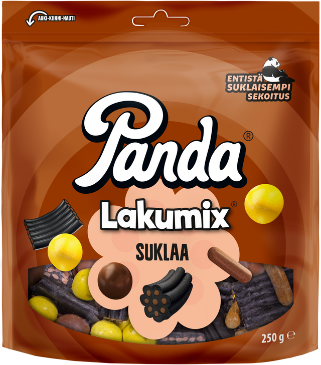Panda Lakumix Choklad är en superläcker blandning av fem olika sötsaker som kombinerar Pandas ikoniska lakrits med läcker choklad. Fängslande mjuk chokladfylld lakrits, skönt knastrande dragéer och mjölkchoklad som smälter i munnen kröner njutningen. Smaka ny mix som innehåller även mer choklad!