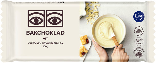 Fazer Ögon vit bakchoklad ger en mild chokladsmak som passar utmärkt till bakverk och desserter eller till färsk frukt och glass. Baka och njut! Och bäst av allt: Vi köper in kakao i enlighet med Fazers kakaovision. Läs mer www.fazercocoavision.com.