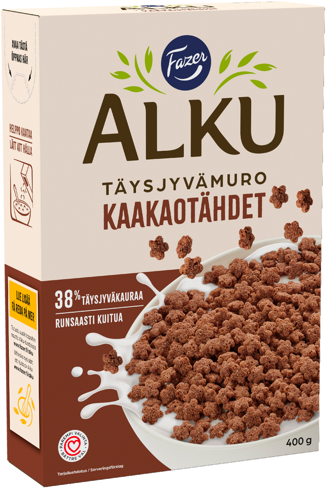 Små och knapriga Kakaostjärnor fullkornsflingor har en härligt fyllig smak av kakao och är skojigt stjärnformade. Flingorna innehåller rikligt med fullkornshavre och fibrer och har beviljats Hjärtmärket. De läckra Alku-flingorna kan ätas med fräsch havredryck, mjölk eller yoghurt – eller naturella. Förpackningen kan återvinnas som kartong. Alku – för alla goda stunder!